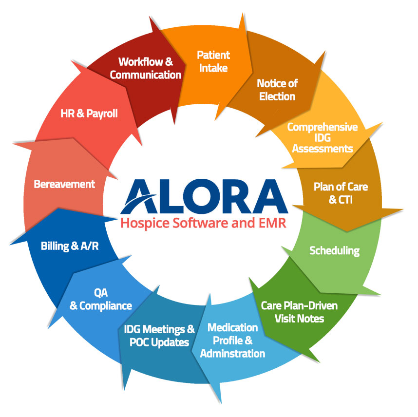 Alora Hospice Software is a cloud-based system that integrates the many aspects of a hospice care agency operation into one comprehensive solution. This easy-to-use software system enables hospice agencies to provide the highest level of care for their patients while maintaining maximal operational efficiency and compliance.